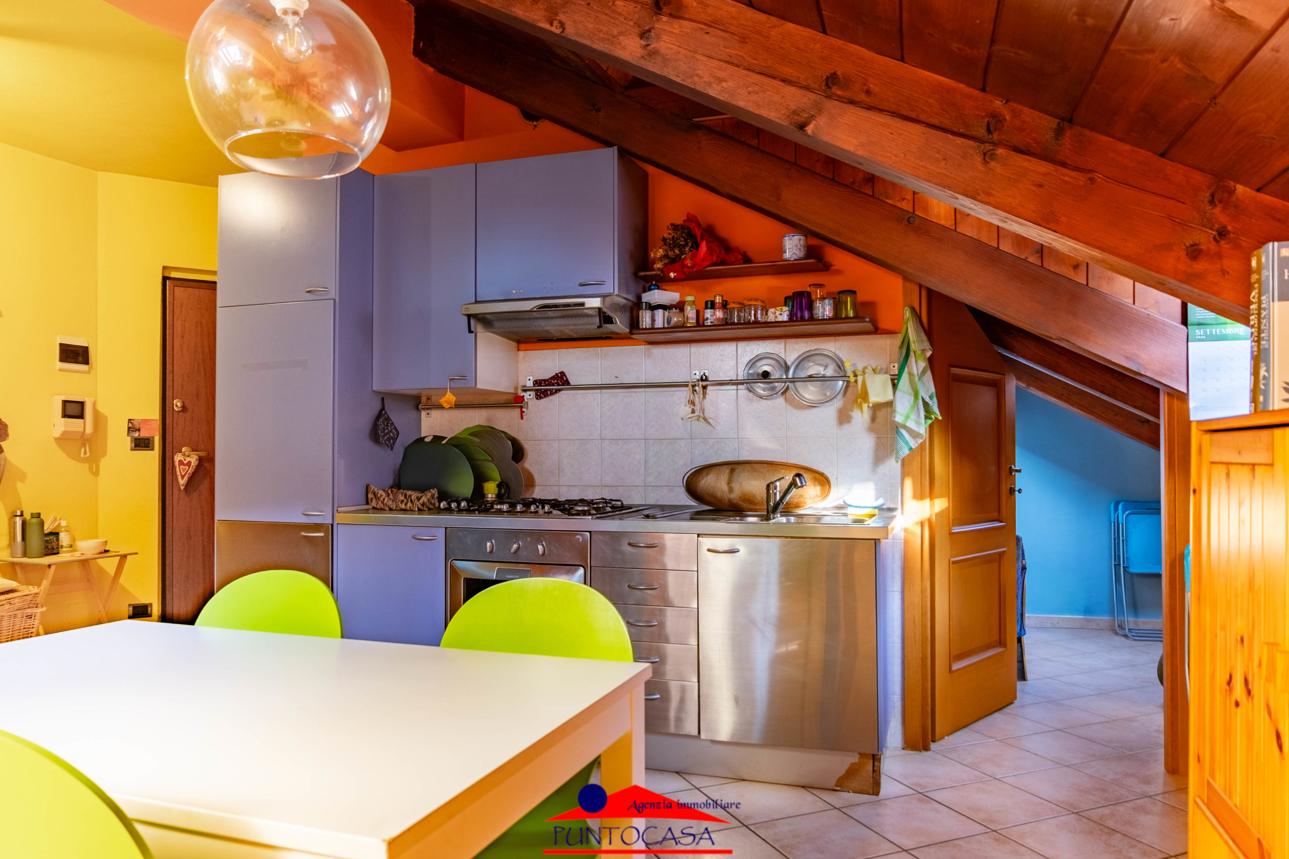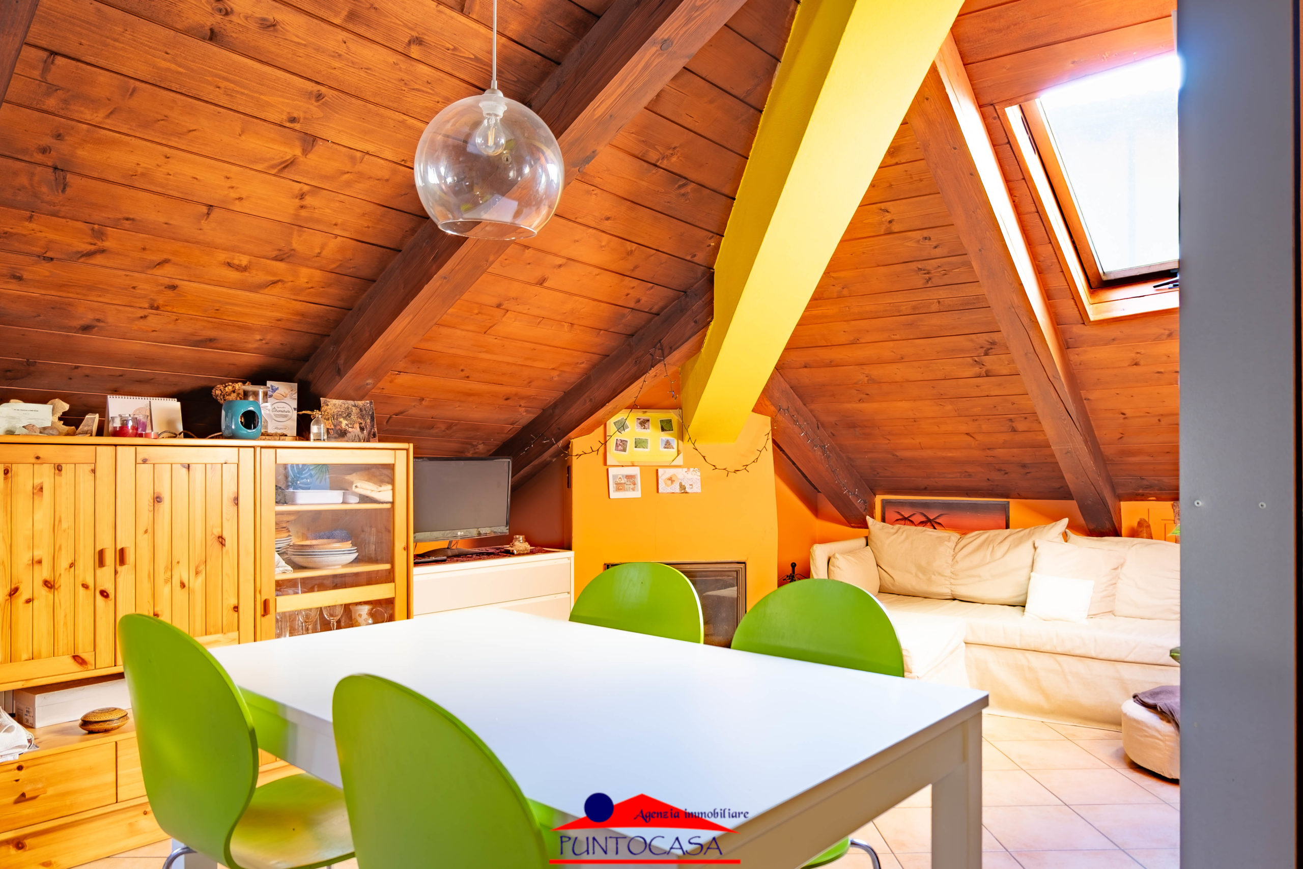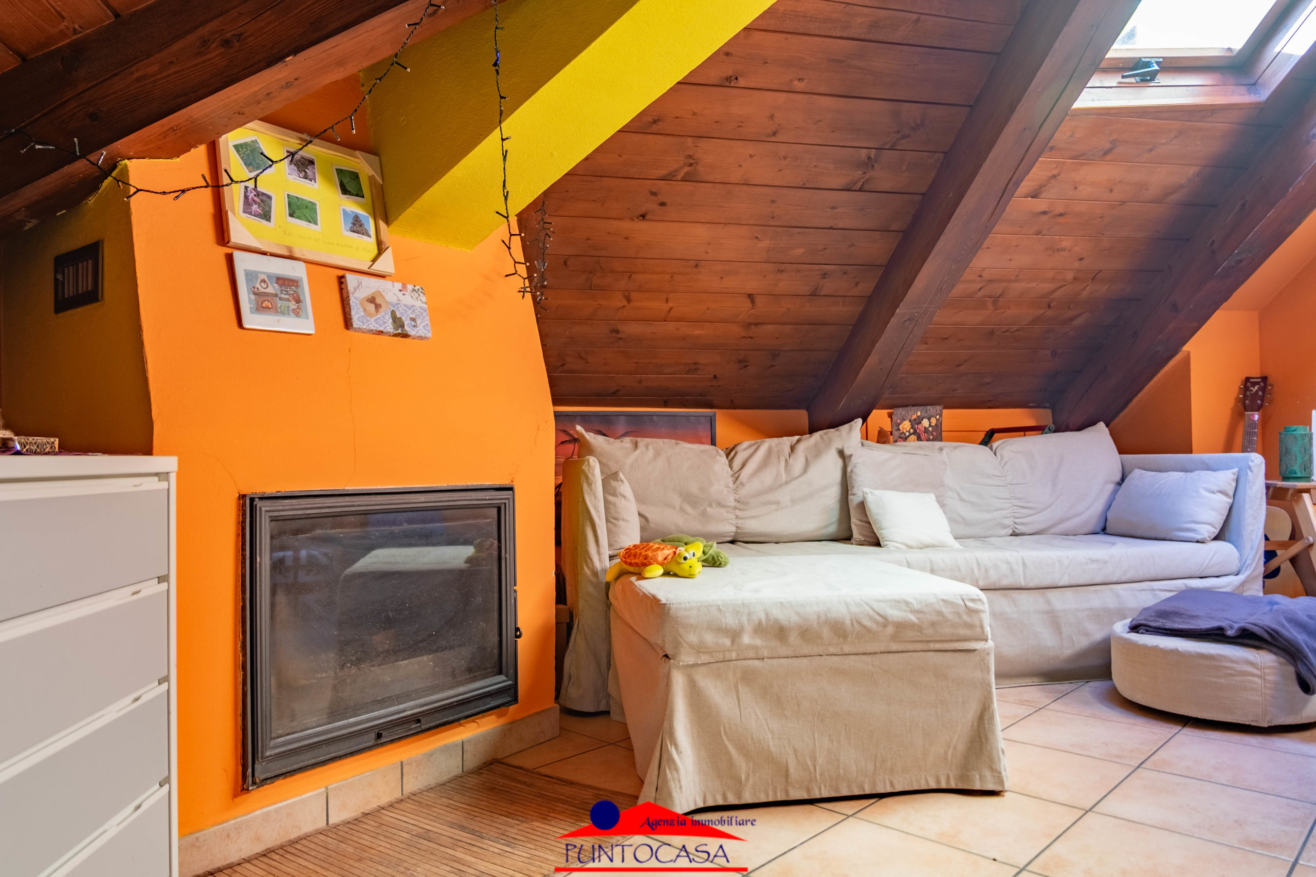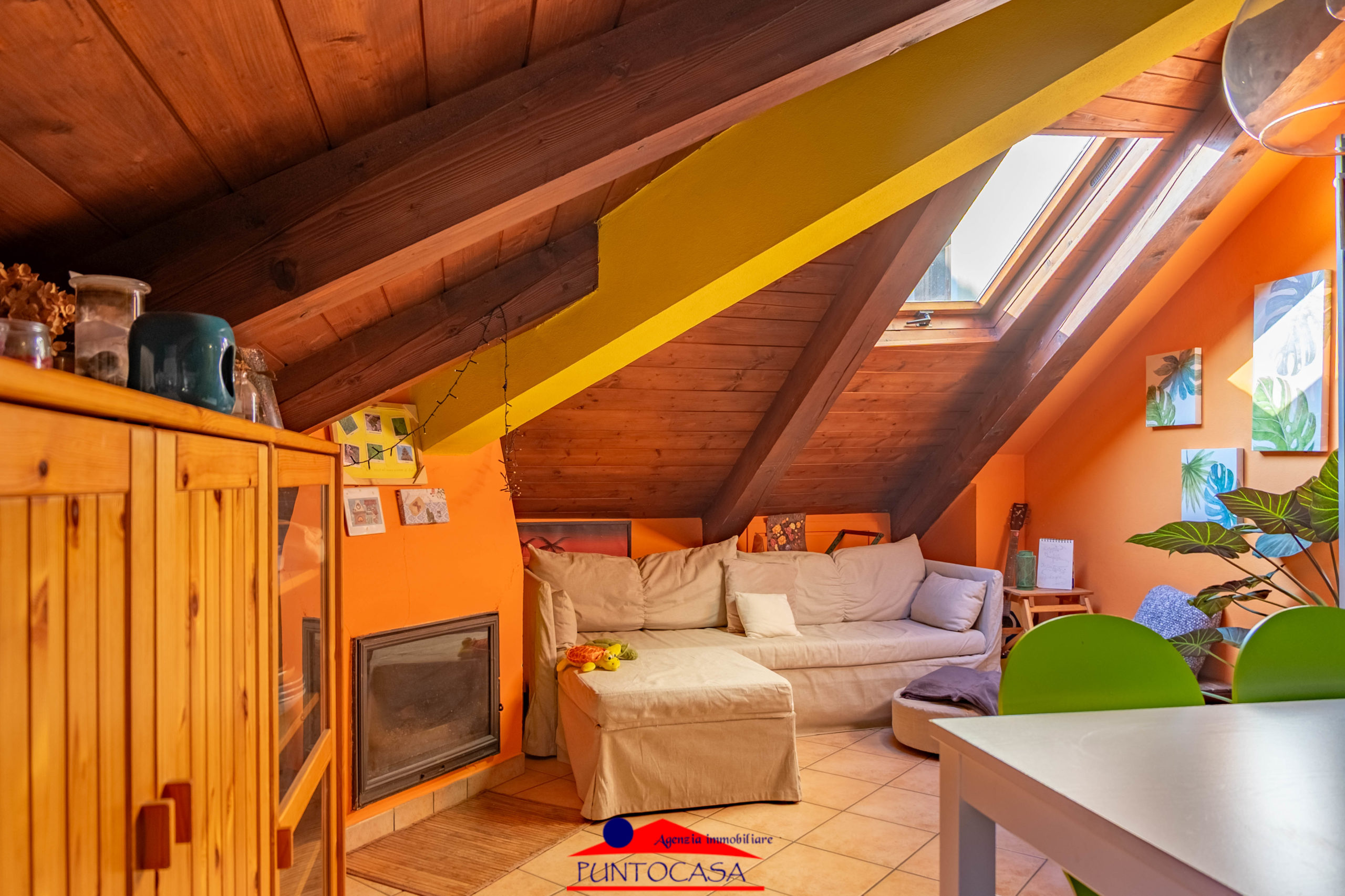 L’ascensore arriva direttamente al piano, accogliendoti in una luminosa zona giorno con soffitti a vista e un caminetto che rende l’atmosfera intima e rilassante.